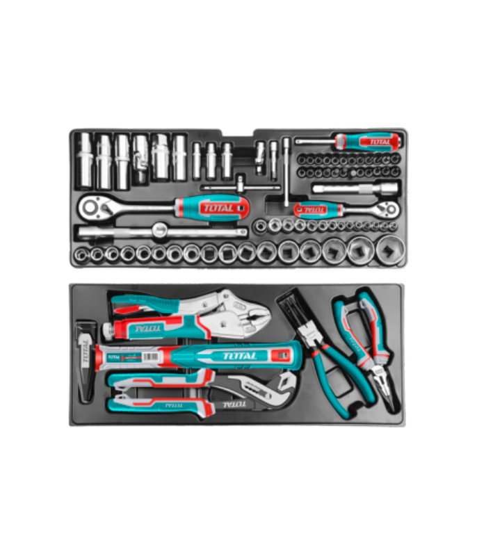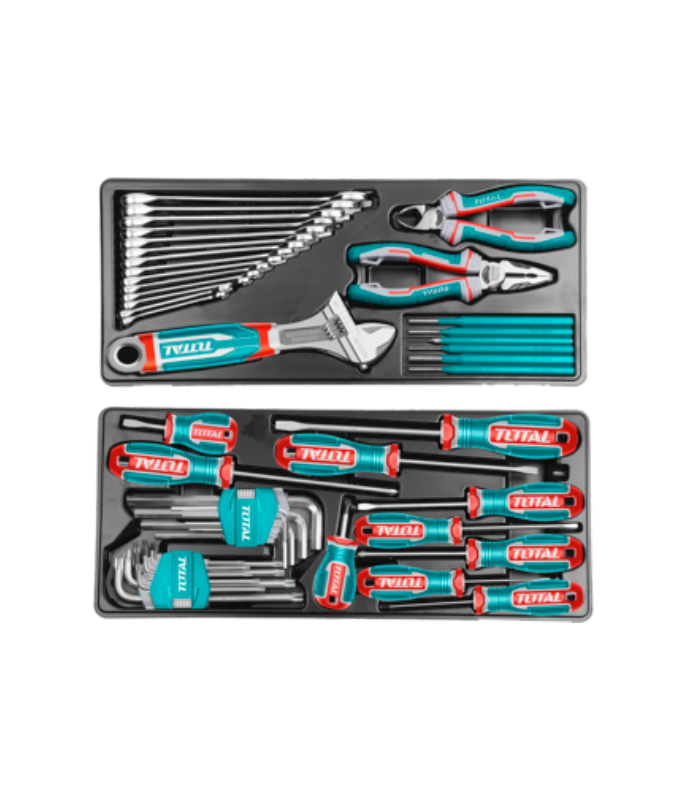 ✔ Herramientas como llaves de trinquete, dados, puntas, extensiones, destornilladores, llaves combinadas, alicates, martillo y más