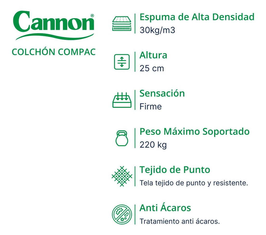 ✨ Colchón 2 Plazas Cannon Compac Alta Densidad Extra Firme 140 × 190 × 25 cm – Soporte y Confort Óptimos ✨