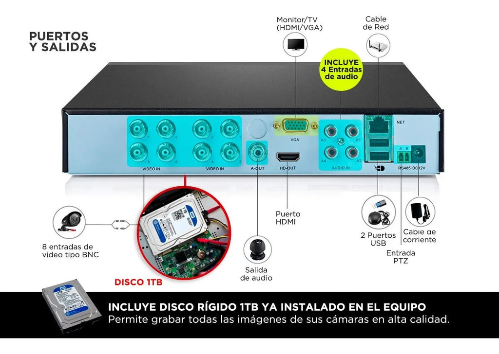✔ DVR con grabación integrada y disco rígido de 1 TB para almacenamiento extendido